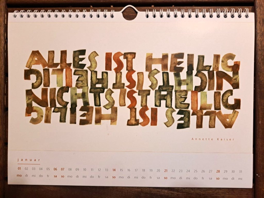 Das Kalenderblatt vom Januar 2024 konfrontiert uns mit einem Zitat der spirituellen Lehrerin Annette Kaiser. Hans Neidhardt, von dem auch wieder alle Kalenderklätter des gesamten Jahres stammen, hat es für uns grafisch aufbereitet.