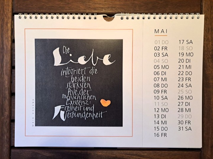 Die Liebe integriert die beiden stärksten Pole der menschlichen Existenz:FREIHEIT UND VERBUNDENHEIT Maik Hosang Kalligrafie: Hans Neidhardt Teilen mit: Klick, um auf Facebook zu teilen (Wird in neuem Fenster geöffnet) Facebook Klick, um auf LinkedIn zu teilen (Wird in neuem Fenster geöffnet) LinkedIn Klicke, um auf X zu teilen (Wird in neuem Fenster geöffnet) X Klick, um auf Pinterest zu teilen (Wird in neuem Fenster geöffnet) Pinterest Gefällt mir Wird geladen … Ähnliche Beiträge