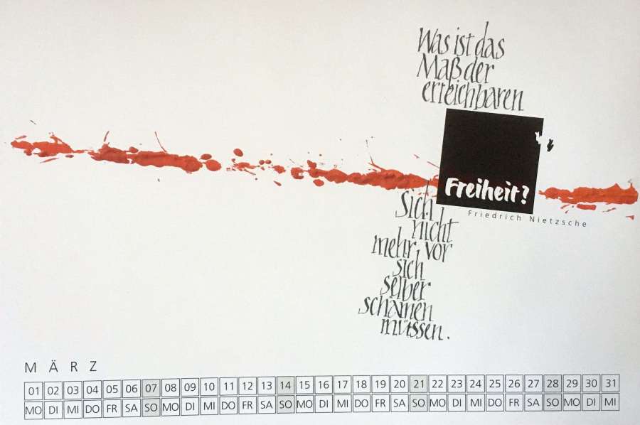 Das Kalenderblatt des Monats März bringt einen Spruch von Friedrich Nietzsche, eingebunden in die kalligrafische Kunst von Hans Neidhardt.
