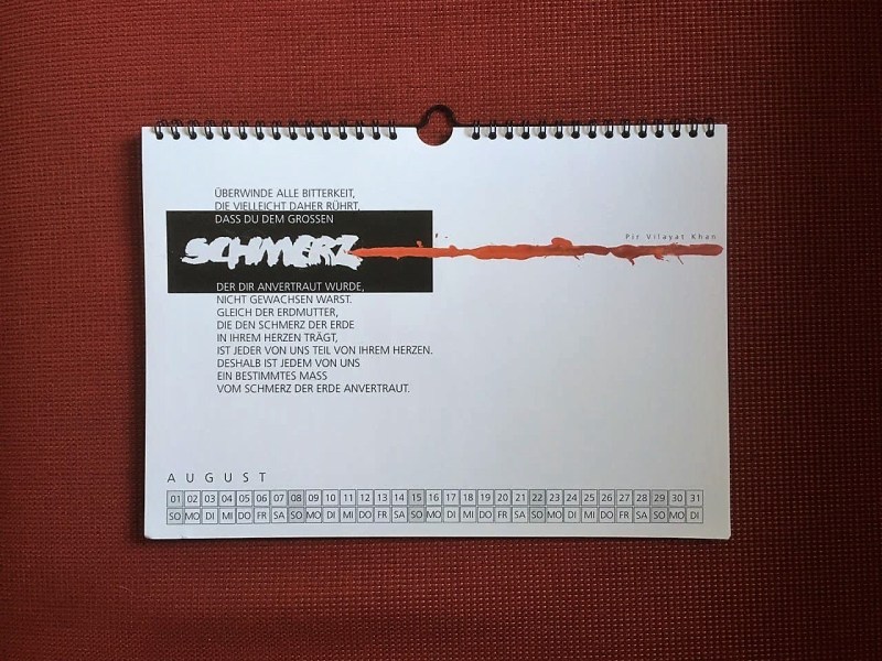Ein schwarzes Rechteck in der linken oberen Bildhälfte dominiert das Augustkalenderblatt von Hans Neidhardt. Darin wiederum nimmt das Wort Schmerz, wie mit dickem weißen Pinsel geschrieben, den Raum ein.